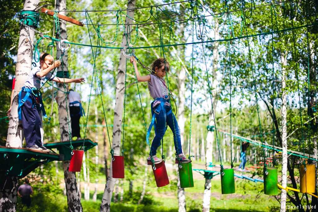 Веревочный парк находится за детской площадкой и предназначен для детей до 12 лет. Здесь есть маршруты для новичков и бывалых экстремалов. С детьми работает опытный инструктор.